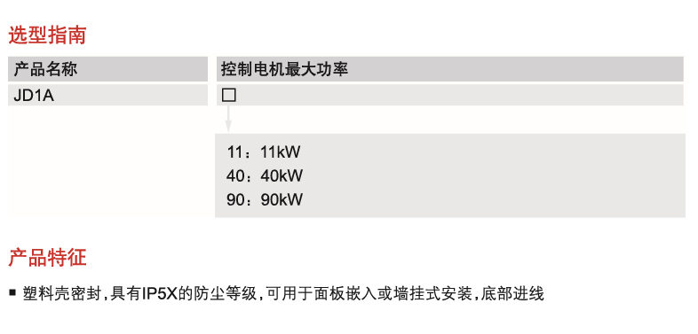 The plastic shell seal of JD1A series electromagnetic speed control motor controller has IP5X dustproof level, and can be panel-embedded or wall-mounted, with an inlet at bottom.
