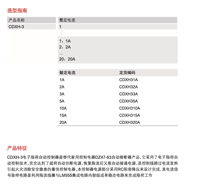 CDXH-3 electronic load limiting automatic controller is an alternative of the household control electrical appliances DZ47-63 automatic fuse product. With electronic load limiting automatic control technology, it can completely cut off the power supply automatically in case of overload, and can turn on the power supply automatically after restoring the current limit, which is the optimal control electrical appliance to eliminate safety hazards of fire caused by overcurrent heating of the control line. The power supply part of this controller is designed with resistance capacitance voltage-reducing, and the current signal sampling circuit realizes the load limit through the current limiting coil and the LM555 integrated circuit to form a monostable circuit internally.