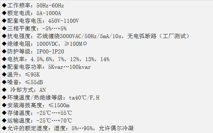 CKSG series three-phase series reactor is used in low-voltage reactive power compensation cabinet, and connected in series with capacitors to limit the closing inrush current of the capacitor in the three-phase co-compensation switching mode and to limit the external inrush current generated when a fault occurred nearby or when the adjacent capacitor is switched or to eliminate response in the power supply container to avoid the reactor from resonance with the power system. Suppress high-order harmonics and improve system power factor to prevent irreversible damage caused by capacitor accidents.