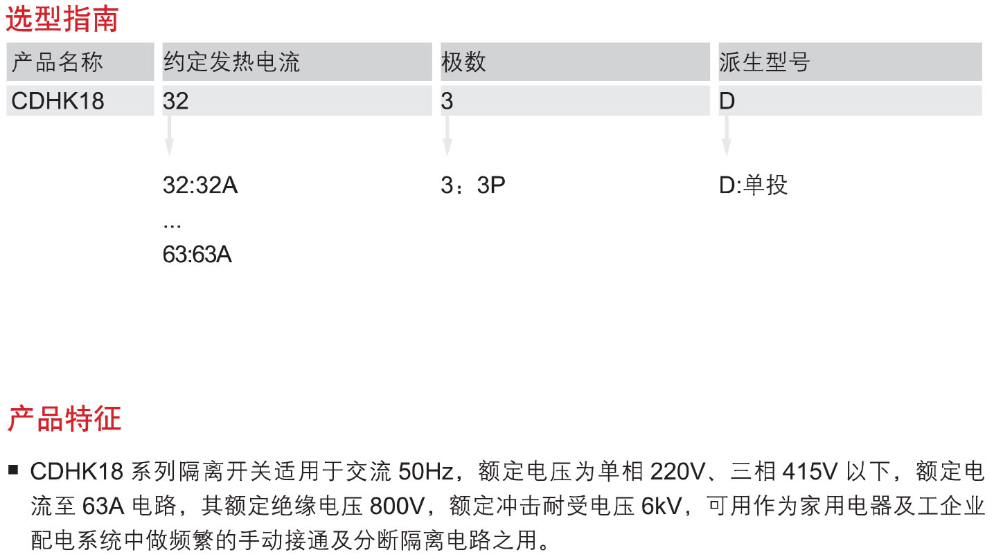 CDHK18 series disconnector is suitable for AC 50Hz circuits with a rated voltage of single-phase 220V, three-phase 415V or less, a rated current up to 63A circuit, a rated insulation voltage 800V, and a rated impulse withstand voltage 6kV for frequent manual connection, disconnection and isolation of circuits in the household appliances and industrial enterprise power distribution system.