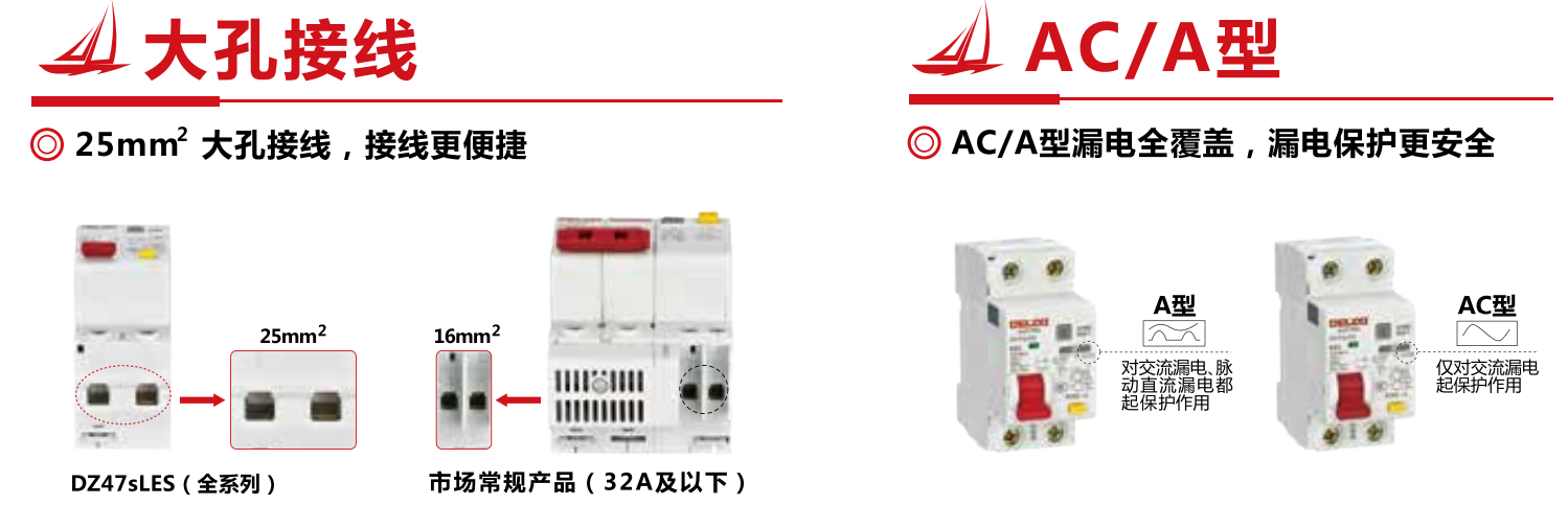 DZ47sLES compact earth leakage circuit breaker is a new series of products carefully developed with integrating innovative technology. This product features with a narrower width, more convenient wiring, more comprehensive protection and more stable performance! It can be suitable for AC 50/60Hz lines with a rated voltage 230V/400V and a rated current 63A and below, with electric leakage, overload, and short circuit protection functions.