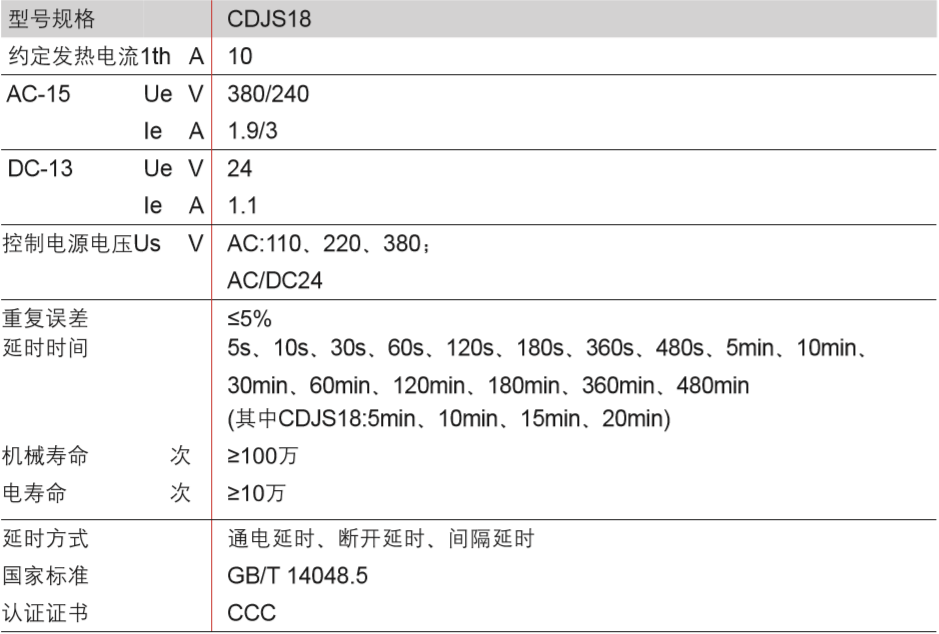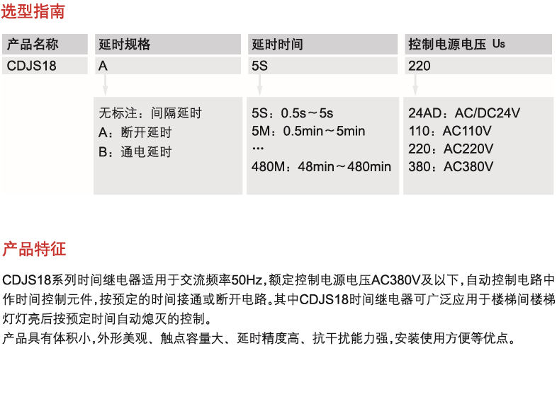 CDJS18 series time relay is suitable for the automatic control circuit with a rated control power supply voltage AC380V and below as a time control element to connect or disconnect circuits according to the predetermined time. CDJS18 is installed on a 35.5mm standard rail; CDJS18 series time relay has three delay methods: CDJS18 (interval delay), CDJS18-A (off delay), and CDJS18-B (power-on delay).