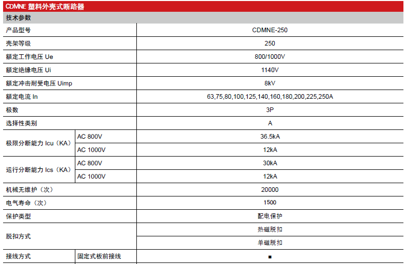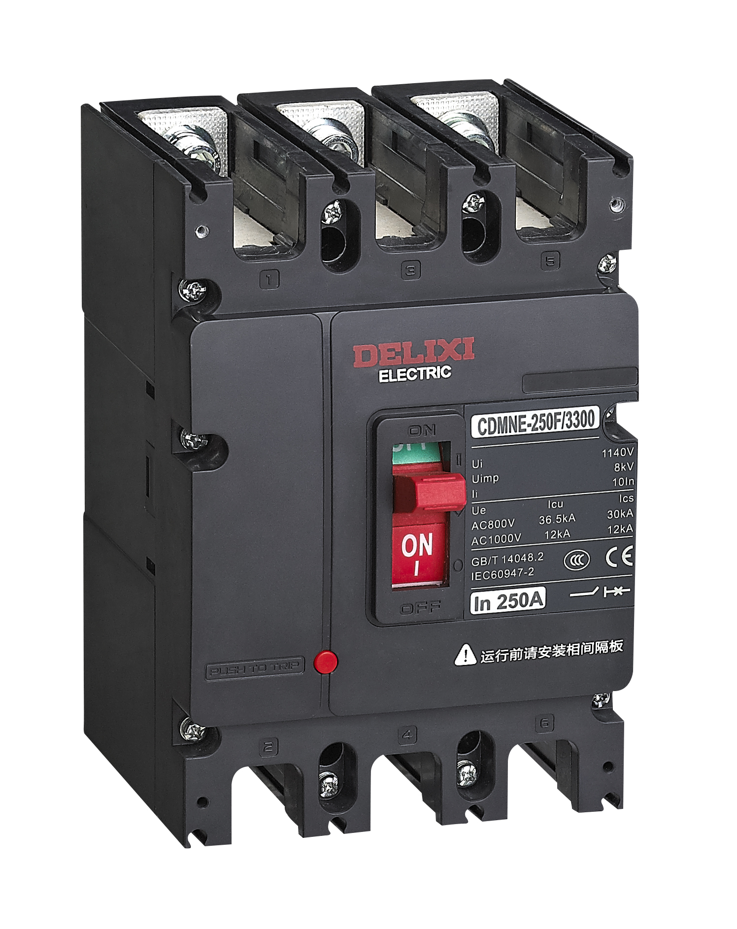CDMNE series moulded case circuit breaker is suitable for AC lines with a rated working voltage AC800/1000V and a rated current 63A~250A, and it can be widely used in the AC combiner box and combiner cabinet in photovoltaic power generation industry and in the grid-connected cabinet in power industry. It is used for electric energy distribution and line and power equipment protection to avoid hazards caused by faults such as overload and short circuit.