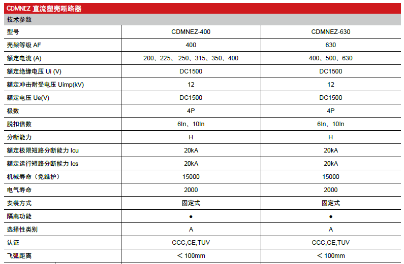 CDMNEZ DC moulded case circuit breaker is suitable for DC circuit with a rated voltage DC1500V and a rated current 200A~630A, and can be widely used combiner box, inverter, and energy storage system in photovoltaic power generation and energy storage industry for electric energy distribution and for line equipment protection to avoid hazards caused by faults such as overload and short circuit.