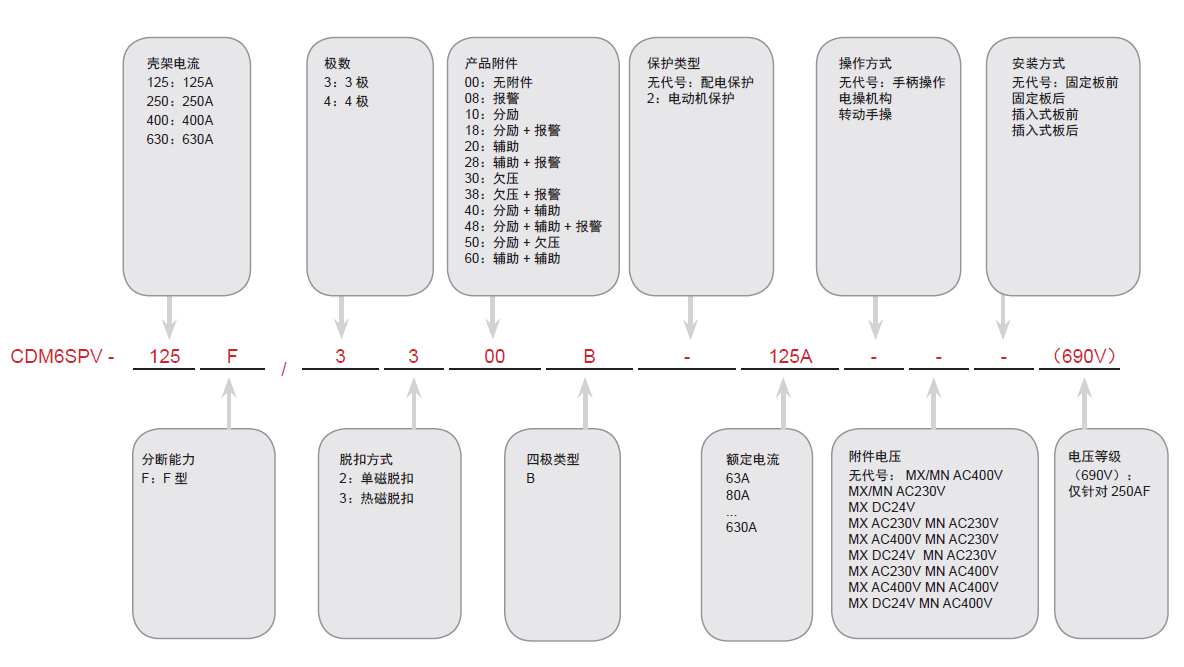 CDM6SPV photovoltaic special series moulded case circuit breaker is suitable for AC circuit with a rated working voltage AC480V, AC500V, AC690V, and a rated current 63A ~ 630A AC circuit, and can be widely used in photovoltaic power generation and combiner box for electric energy distribution and for the protection of lines and power equipment to prevent fault hazards such as overload and short circuit.