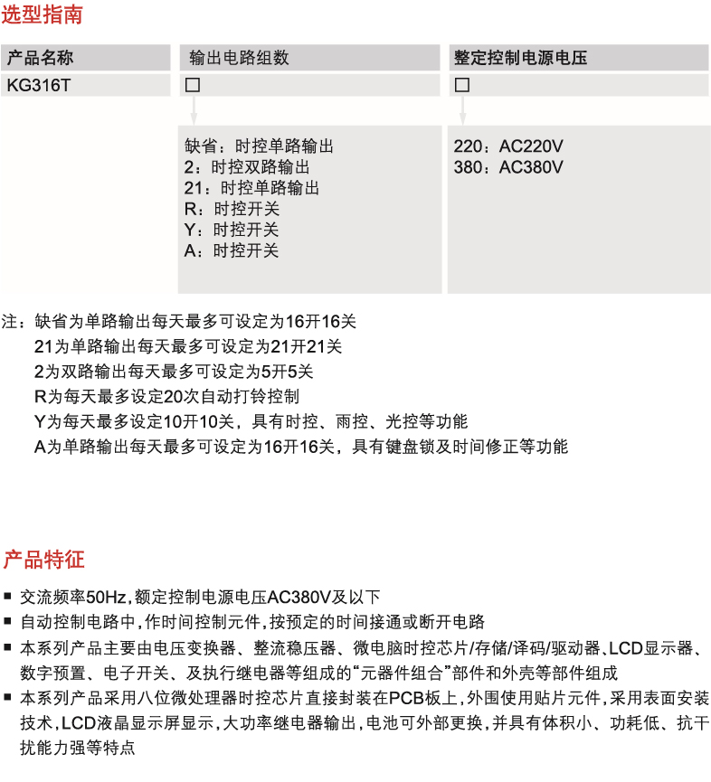 This series products mainly consist of the "component combination" part composed of voltage converters, rectifier regulators, microcomputer timing control chips/storage/decoding/drivers, LCD displays, digital presets, electronic switches, and actuator relay, and the shell. This series of products adopts eight-bit microprocessor time control chip directly packaged on the PCB board, the peripheral uses chip components; it uses surface mounting technology, LCD display, and high-power relay output, and its battery can be externally replaced, featuring with small size, low power consumption, and strong anti-interference ability.