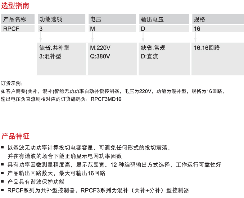 RPCF intelligent reactive power automatic compensation controller calculates the switching capacitor capacity with fundamental reactive power to avoid any form of switching oscillation, and can correctly display the power factor of the power grid in the harmonics field. The product features with high power factor measurement accuracy, wide display range, 12 optional encoding output modes, and high reliable operation. The product has a large number of output loops, up to 16 output circuits and has harmonic protection function; RPCF series is a co-complement controller, and RPCF3 series is a hybrid (co-complement + sub-complement) type controller.