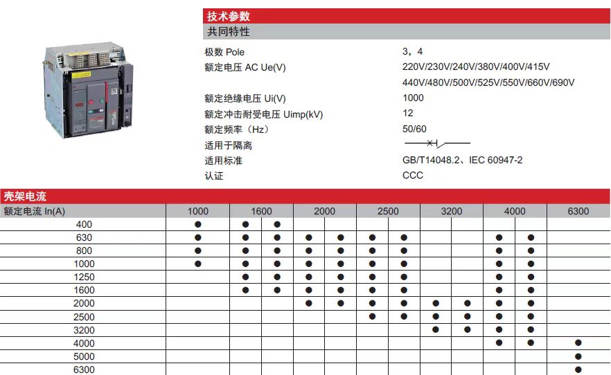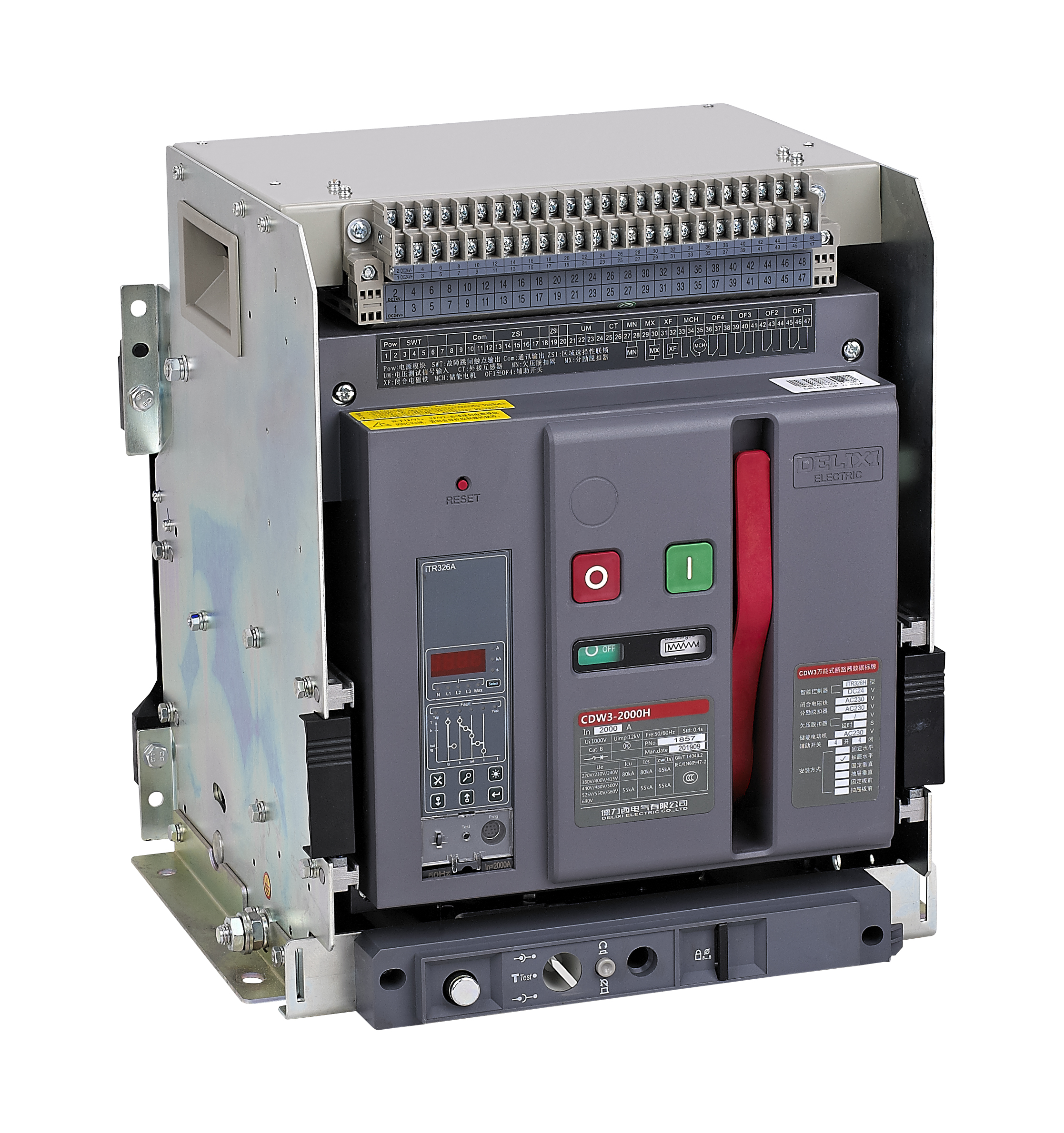 CDW3 series frame circuit breaker has a rated current ranging 400A to 6300A, a rated operating voltage of AC 415V / 690V, suitable for AC 50Hz/60Hz, -40°C~70°C extreme environmental conditions. It is mainly used in power distribution network for the distribution of electric energy and for the protection of the lines and power supply equipment to prevent any risks caused by the faults such as overload, undervoltage, short circuit, and single-phase grounding. The circuit breaker can be widely used in the power distribution systems in power stations, factories, mines and modern high-rise buildings, especially in intelligent buildings. Standard: GB14048.2 IEC/EN 60947-2