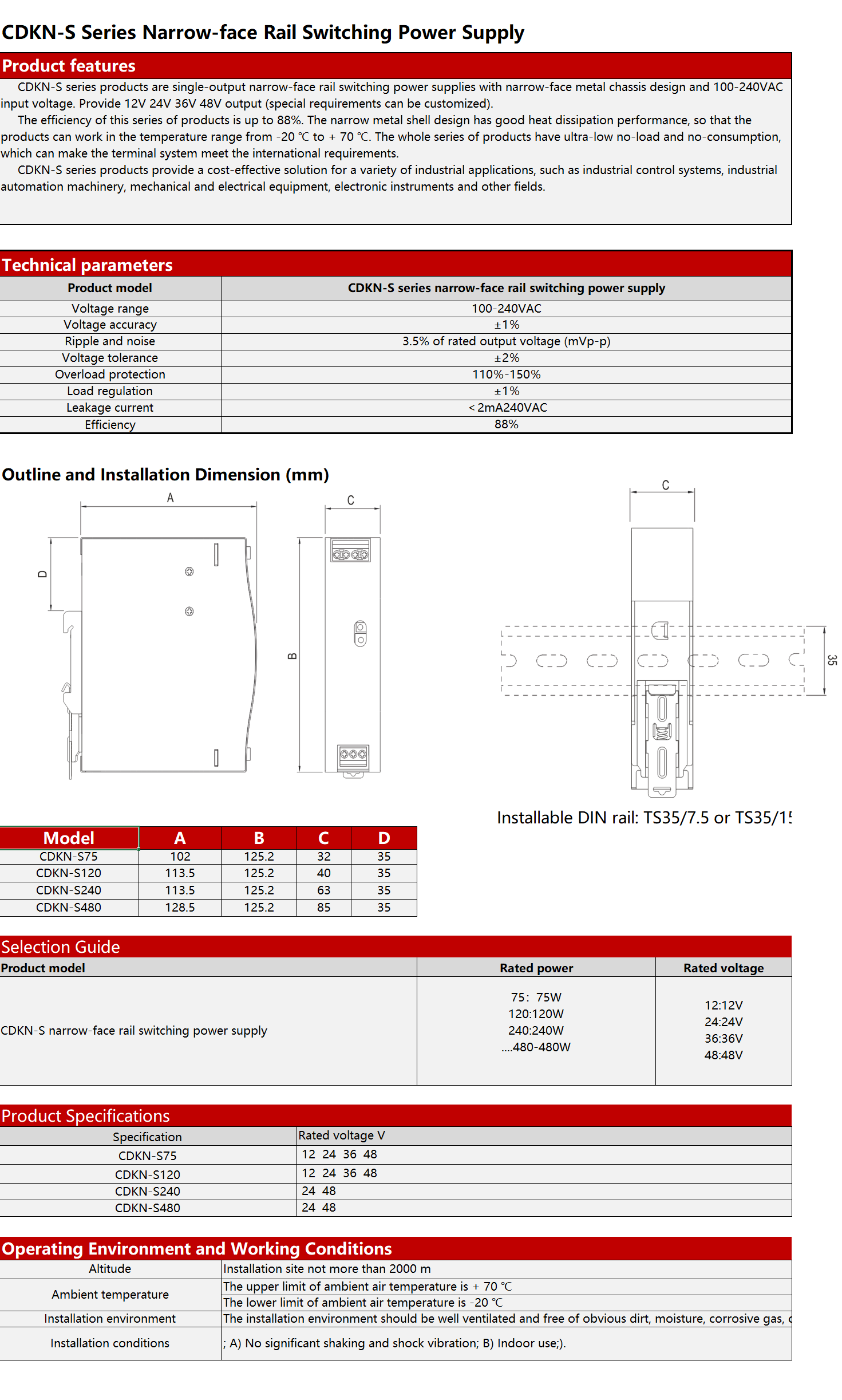 CDKN-S series products are single-output narrow-sided rail switching power supplies with narrow-sided metal shell appearance design, and it adopts 100-240VAC input voltage, and provides 12V 24V 36V 48V outputs (special requirements can be customized). This series of products has an efficiency up to 88%, with narrow-faced metal shell design to provide good heat dissipation performance, making the product can work in the temperature range of -20℃ to +70℃; the whole series of products has ultra-low no-load and no-consumption, making the terminal system meet the international energy requirements. CDKN-S series products provide a cost-effective solution for various industrial applications; products are used in industrial control systems, industrial automation machinery, mechanical and electrical equipment, and electronic instruments.