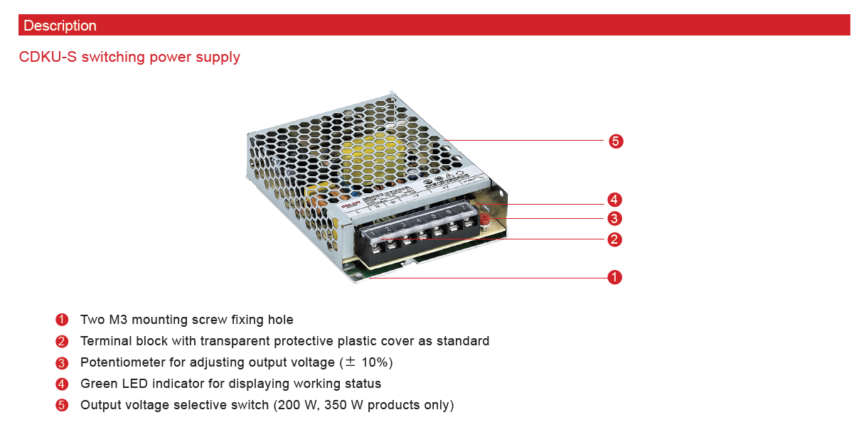 CDKU-S series products are single-output enclosed switching power supplies with 30mm ultra-thin design, and adopt 90-264VAC full range input voltage (toggle switch optional for 200W and 350W). Any set of 5V, 12V, 24V, 36V, and 48V single outputs (special requirements can be customized) can be selected. The product adopts full-metallized shell and honeycomb heat dissipation design with good heat dissipation performance; the product can work normally in the environment of -30℃ ~ 70℃ temperature and 20% ~ 90% RH relative humidity, with the efficiency up to 89% and the no-load power consumption as low as 0.2 ~ 1.0W, and they can meet international energy requirements.