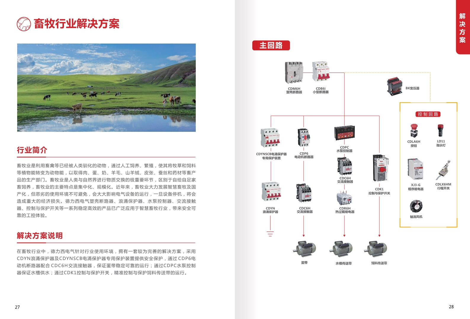 在商牧行業(yè)中,德力西電氣針對行業(yè)使用環(huán)境,擁有一套較為完善的解決方案,采用CDYN浪涌保護(hù)器及CDYNSCB電涌保護(hù)器專用保護(hù)裝置提供安全保護(hù)﹐通過CDP6電動機(jī)斷路器配合CDC6H交流接觸器,保證蛋帶穩(wěn)定可靠的運(yùn)行﹔通過CDPC水泵控制器保證水槽供水﹔通過CDK1控制與保護(hù)開關(guān)﹐結(jié)準(zhǔn)控制與保護(hù)飼料傳送帶的運(yùn)行。