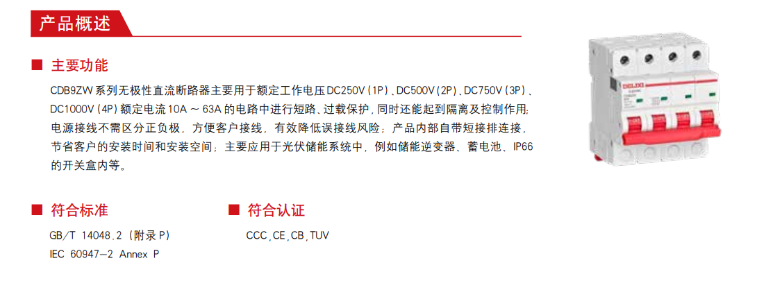 CDB9ZW系列無極性直流斷路器主要用于額定工作電壓DC250V(1P)、DC500V(2P)、DC750V(3P)、DC1000V(4P)額定電流10A~63A的電路中進行短路、過載保護,同時還能起到隔離及控制作用;電源接線不需區(qū)分正負極,方便客戶接線,有效降低誤接線風險;產(chǎn)品內部自帶短接排連接,節(jié)省客戶的安裝時間和安裝空間;主要應用于光伏儲能系統(tǒng)中,例如儲能逆變器、蓄電池、IP66的開關盒內等。